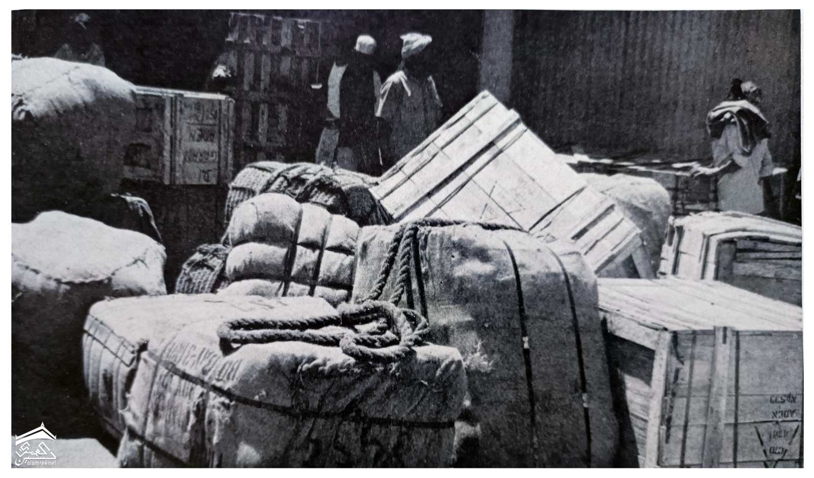 البضائع التي انزلت من احدى السفن في طريقها الى مخازن ميناء عدن |