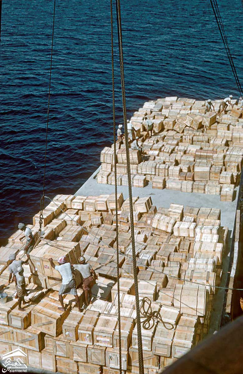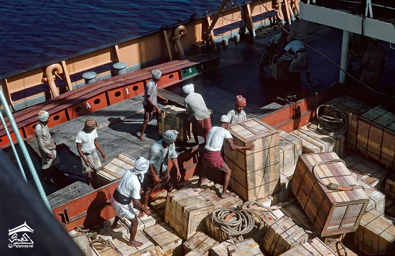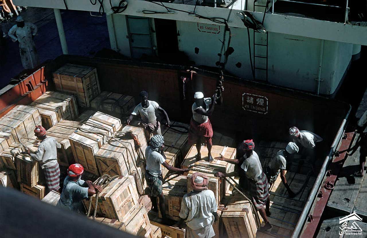 ميناء عدن عام 1958م وعمال المرفاء "البسطه" يفرغون احد الخنون من البضائع في
