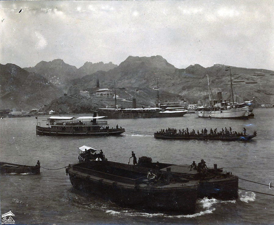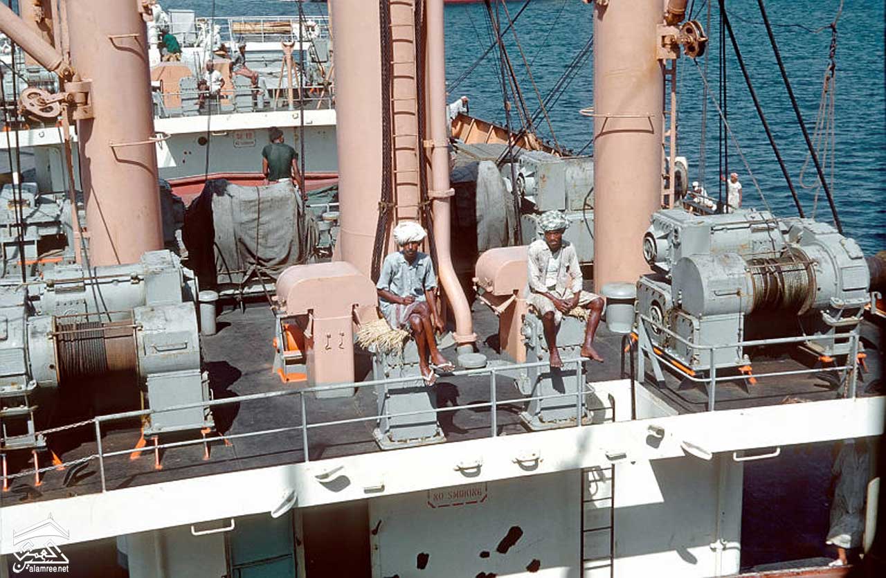 ميناء عدن عام 1958م وعمال المرفاء في احدى السفن التجارية وهنا نلاحظ المقادمه المشرفين على