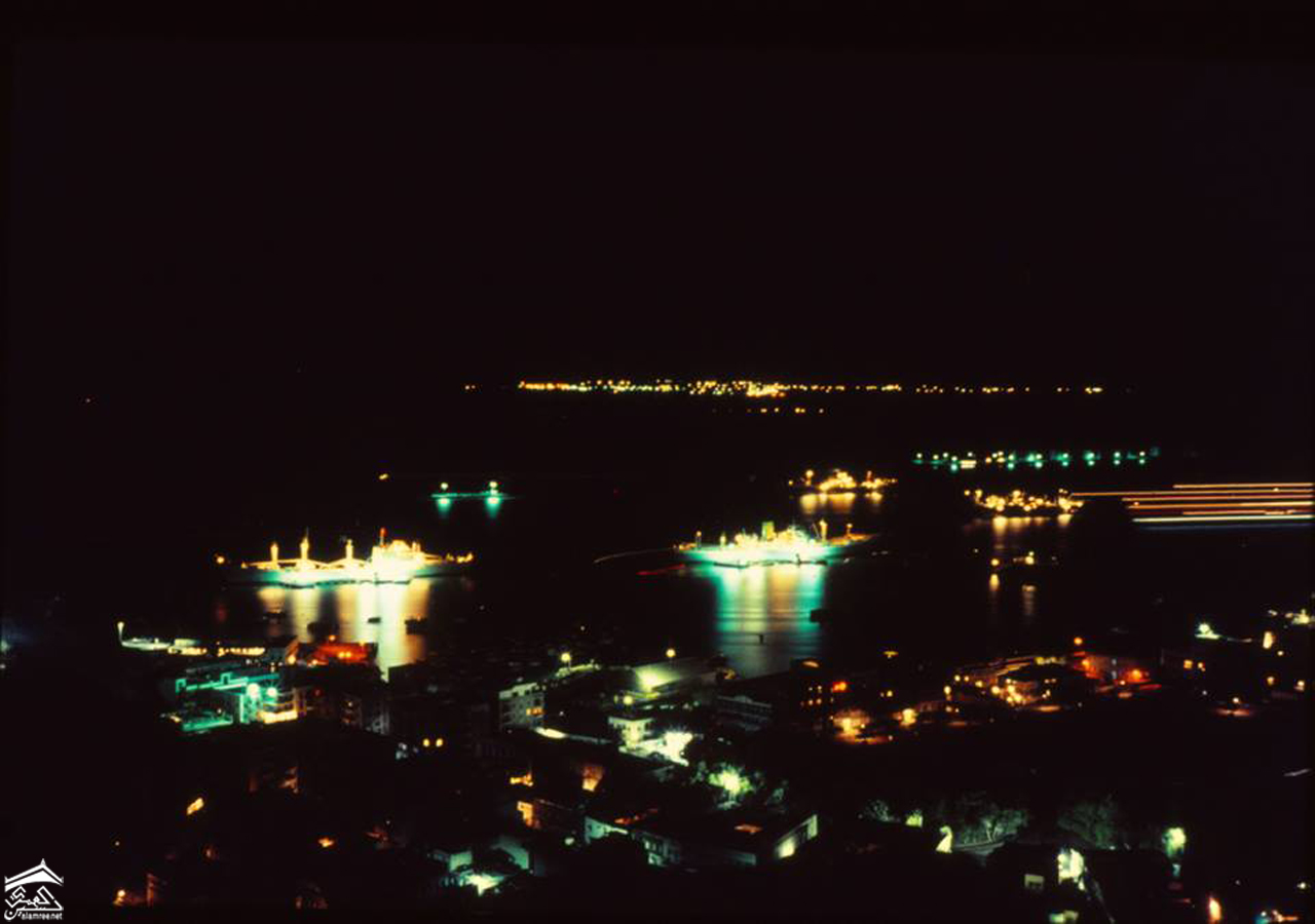 صورة ليلية لميناء عدن وانعكاس الاضواء السفن على سطح البحر