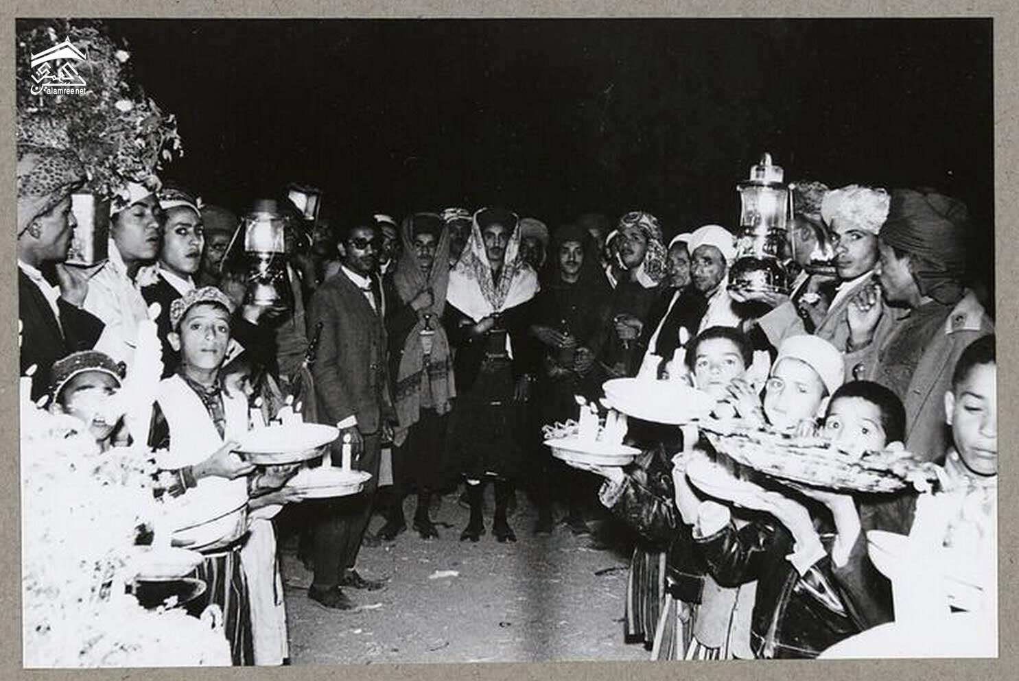 مصباحًا يعمل بالغاز البترولي ويمشي أمام الموكب. ينغمس الأولاد الصغار