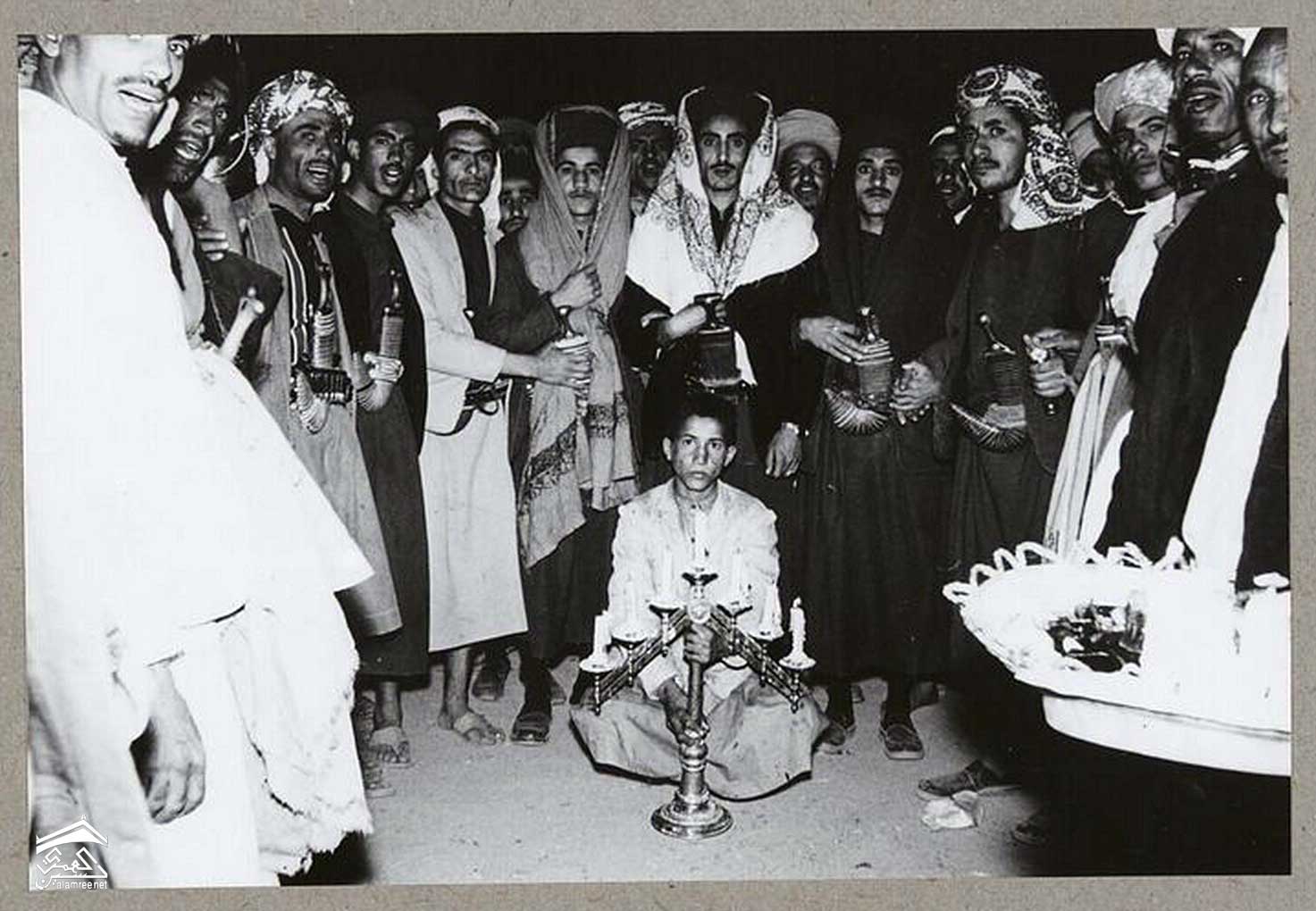 وبمناسبة حفل الزفاف يرافق العريس موكب من صالة الاستقبال الى المسجد والعكس. على رأس الموكب ، يرفع صبي شمعدانًا فضيًا صلبًا بسبعة فروع ، وهو تذكير غريب بوجود اليهودية في اليمن.