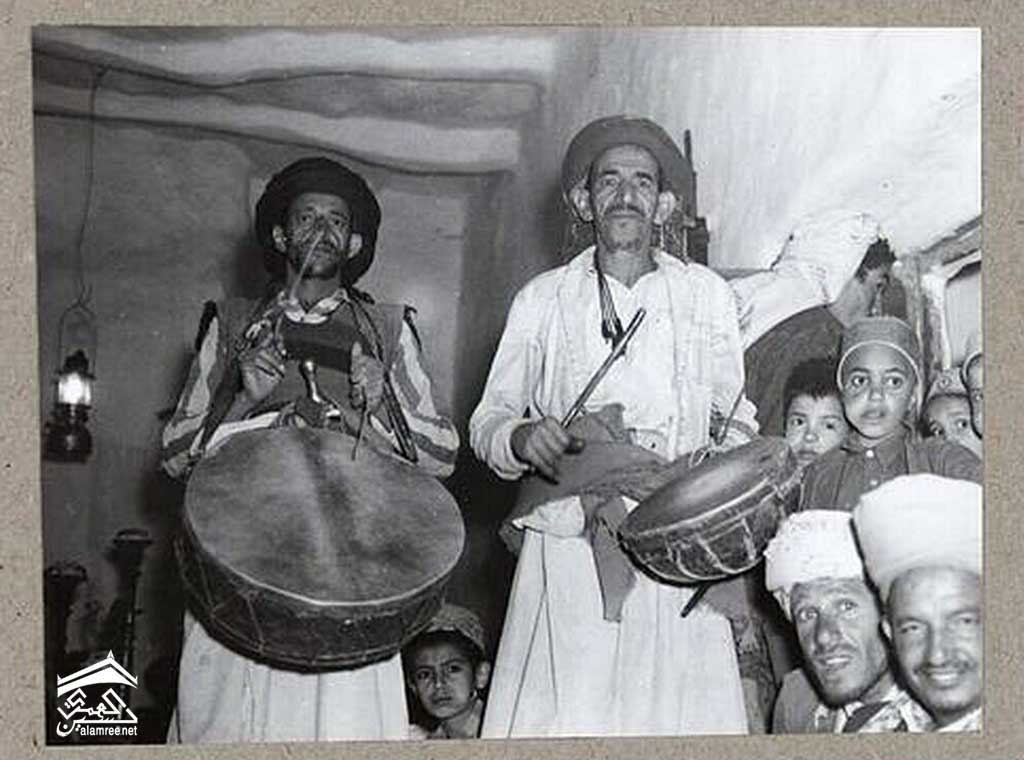 الاحتفال بثلاثية في عمران: العروس والعريس يرتدون شعرهم بطريقة خاصة للانتقال من المنزل إلى المسجد: شال يغطي الرأس والأذنين والكتفين. يشكل العروس والعريس ، المحاطان بأصدقائهما ، موكبًا على رأسه يمشي الصبي حاملاً ثريا من 7 فروع من الفضة الخالصة.
