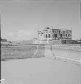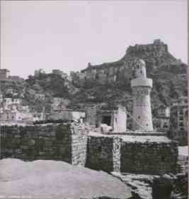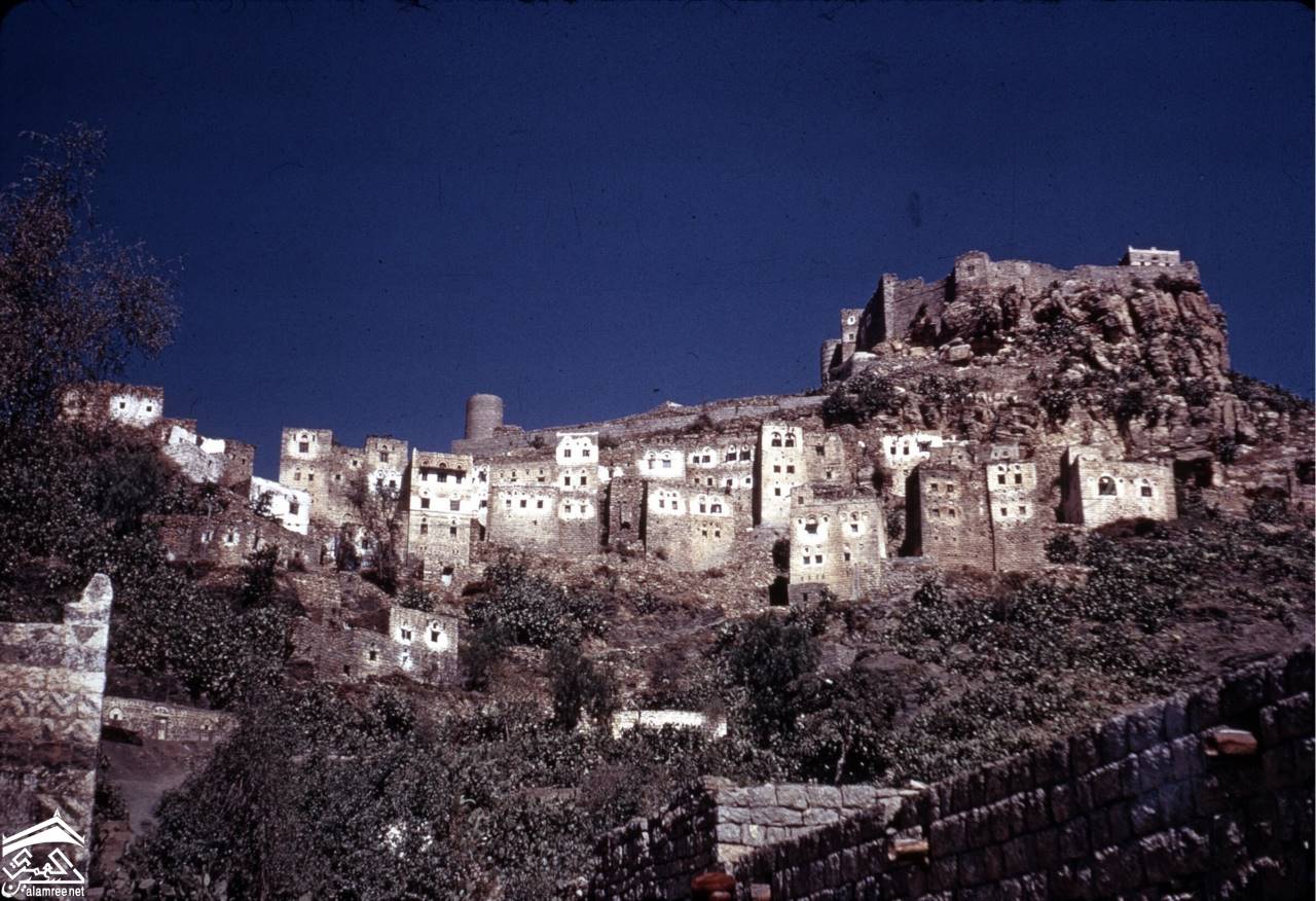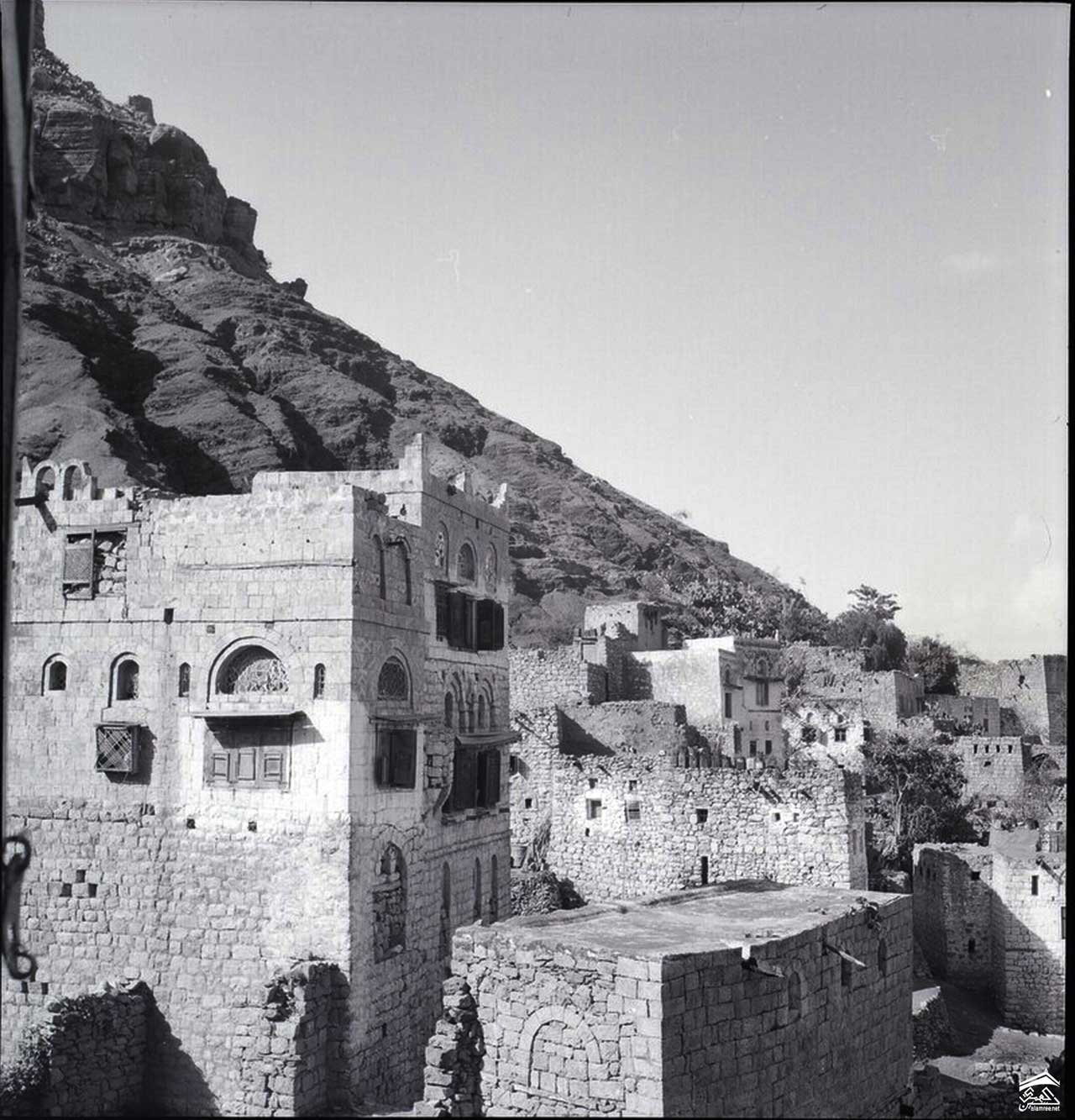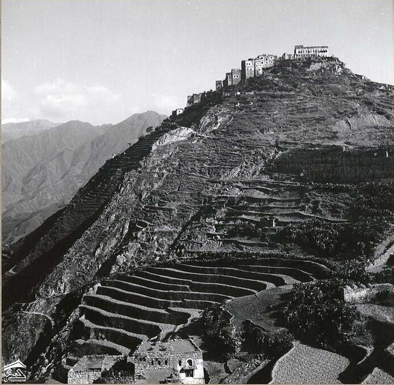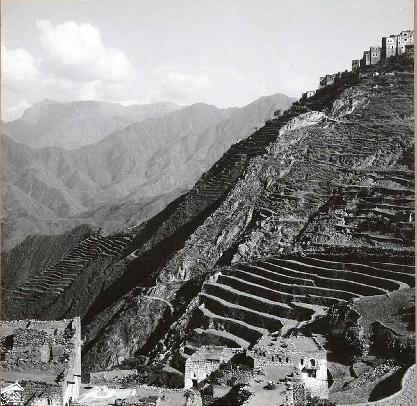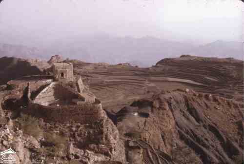 شمال اليمن. حجة. الوالي والصهريج. [منظر جبلي به تراسات ومبنى].