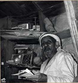 تاجر تبغ في السوق. [رجل مسن ، في محله ، يحمل قطعة من الورق].