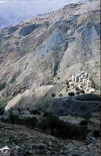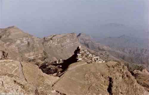 منظر بعيد لقرية على قمة جبل،