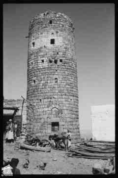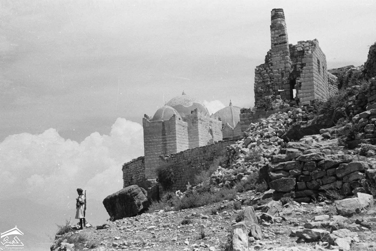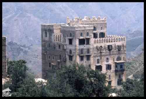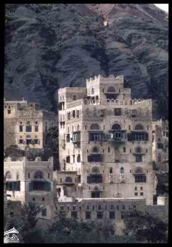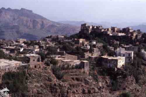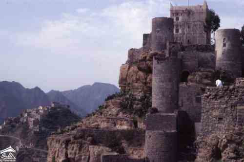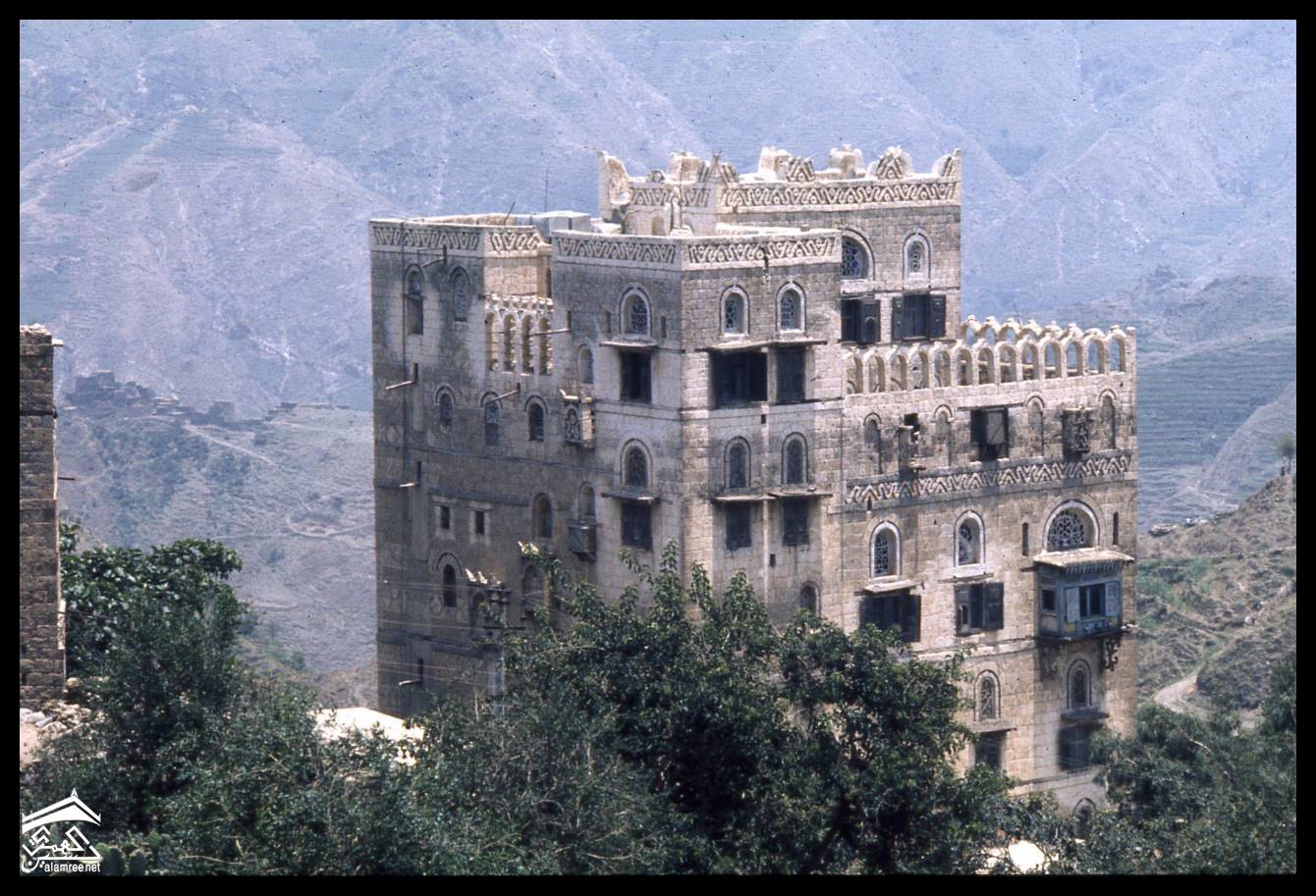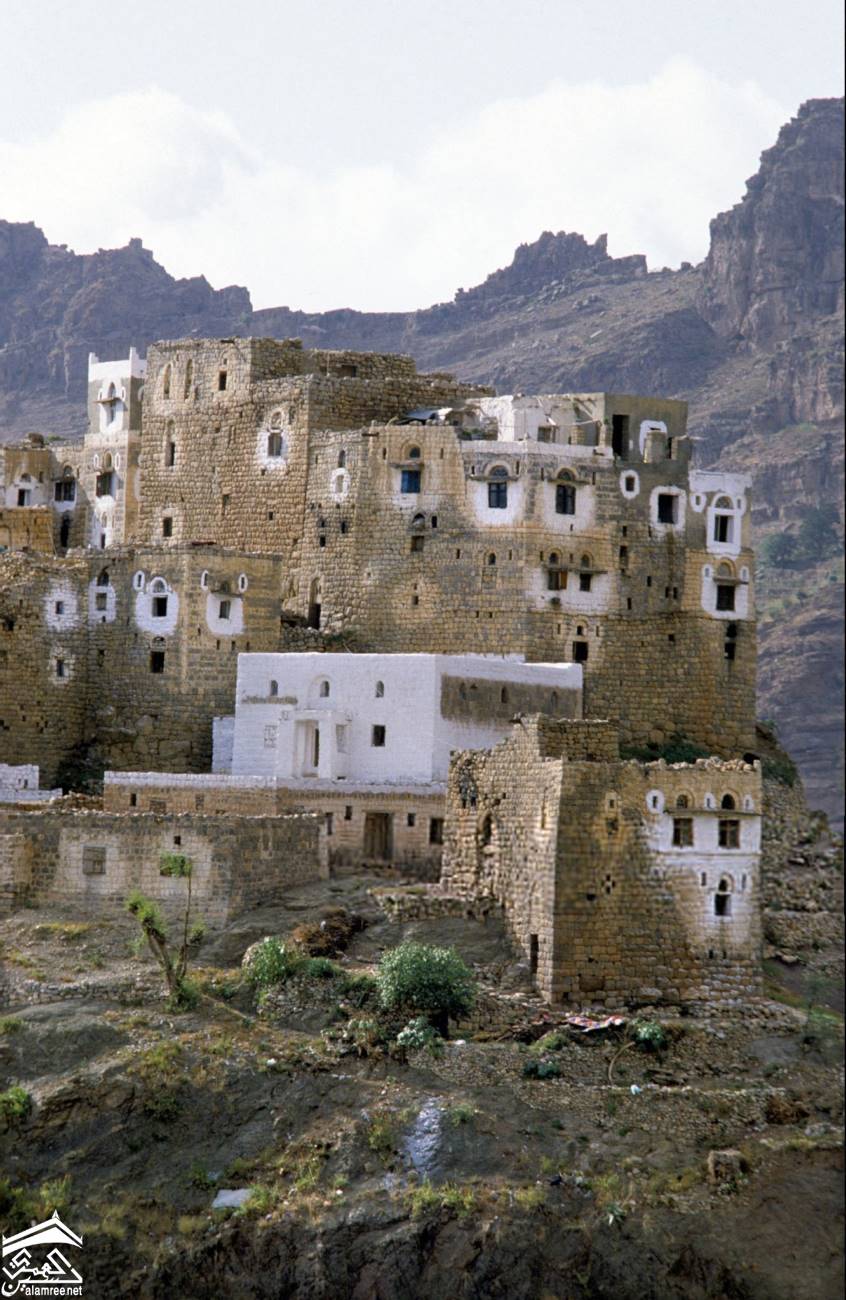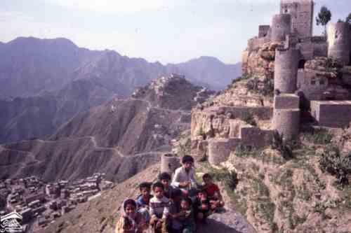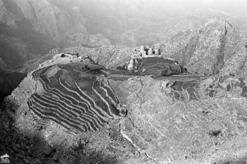 مدينة حجه شمال غرب صنعاء ترتفع 2500 متر فوق مستوى سطح البحر وكانت ذات يوم معقلا للامامه الكهنوتية وتهيمن عليها قلعتها الهائله التي كانت تستخدم كسجن للاحرار اليمنيين الصورة للمصور جوزيف شلهود عام 1956م |