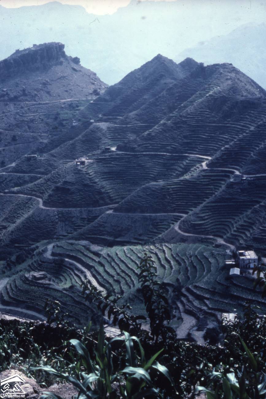 يظهر زراعة المدرجات في منحدر الجبل عام