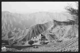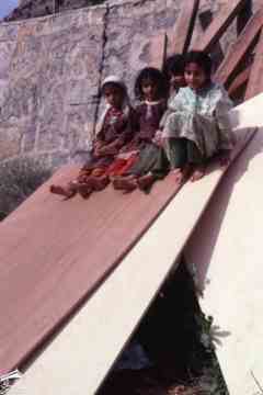 منظر عبر حجة، مع مجموعة من الأطفال يجلسون على نتوء في المقدمة. ترتفع منحدرًا إلى اليمين بعض تحصينات قلعة القاهرة التي تحيط بالقصر. أمامك مباشرة توجد مستوطنة على قمة تل، بها شرفات متدرجة تغطي منحدرات خضراء شديدة الانحدار. تظهر مستوطنة أخرى في واد عميق على يسار الصورة. الجبال ترتفع في الخلفية. تتكون مجموعة الأطفال من تسعة فتيان وفتيات بأعمار مختلفة
