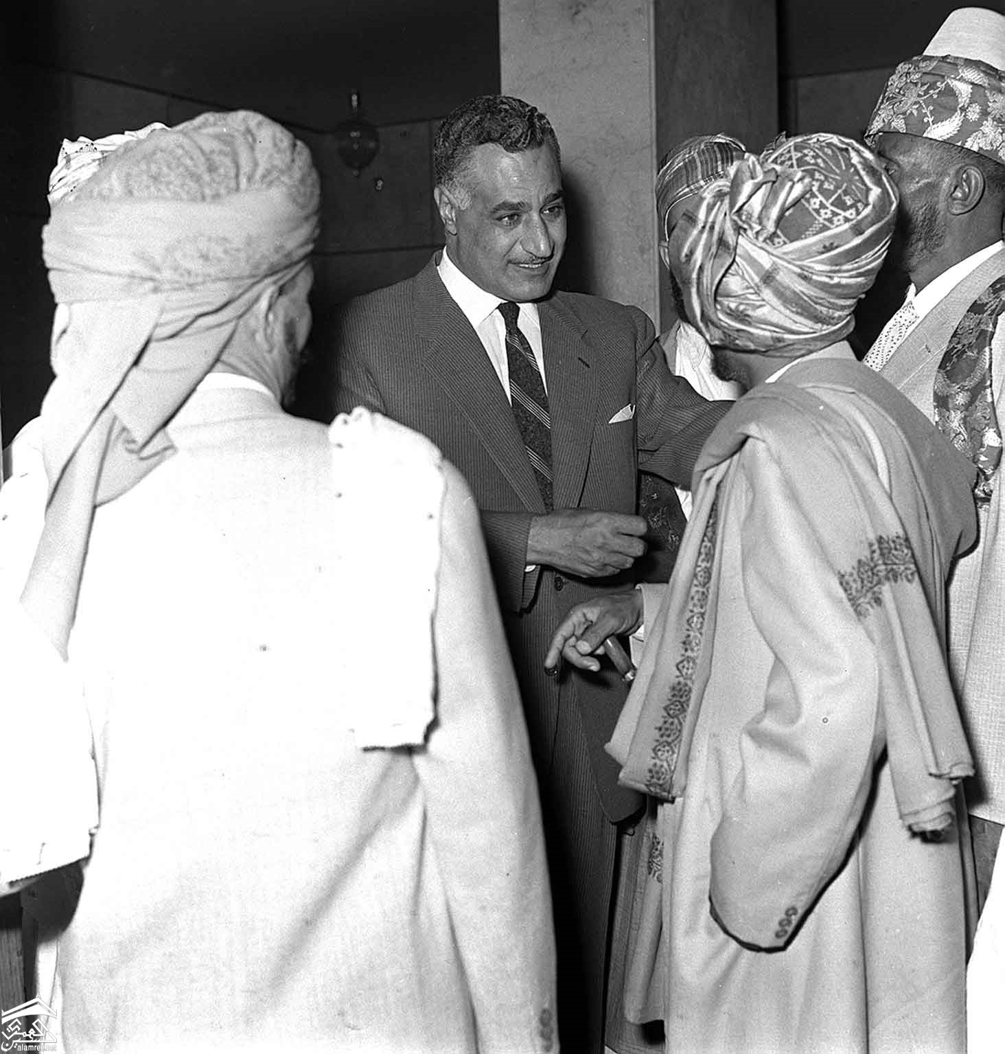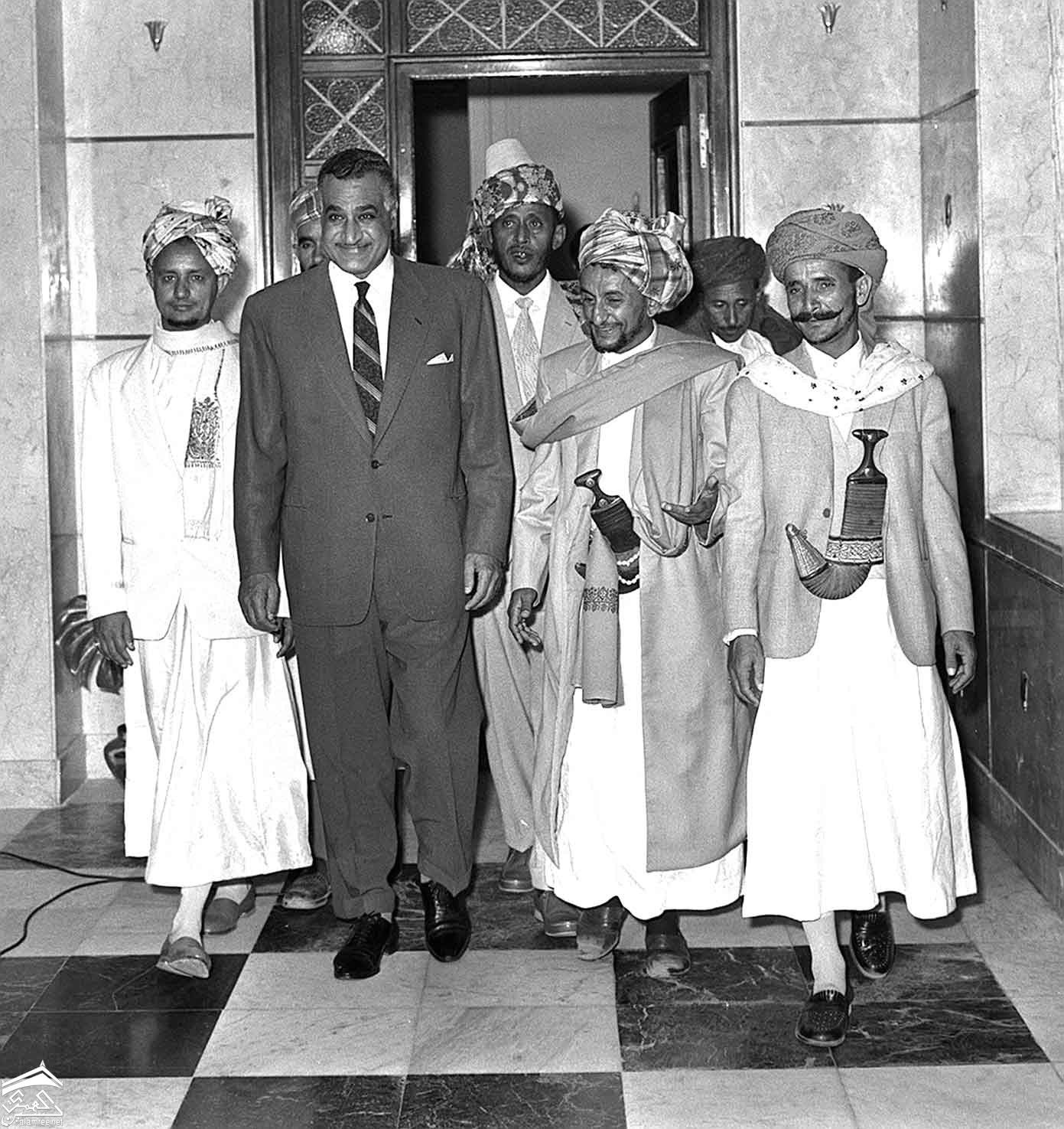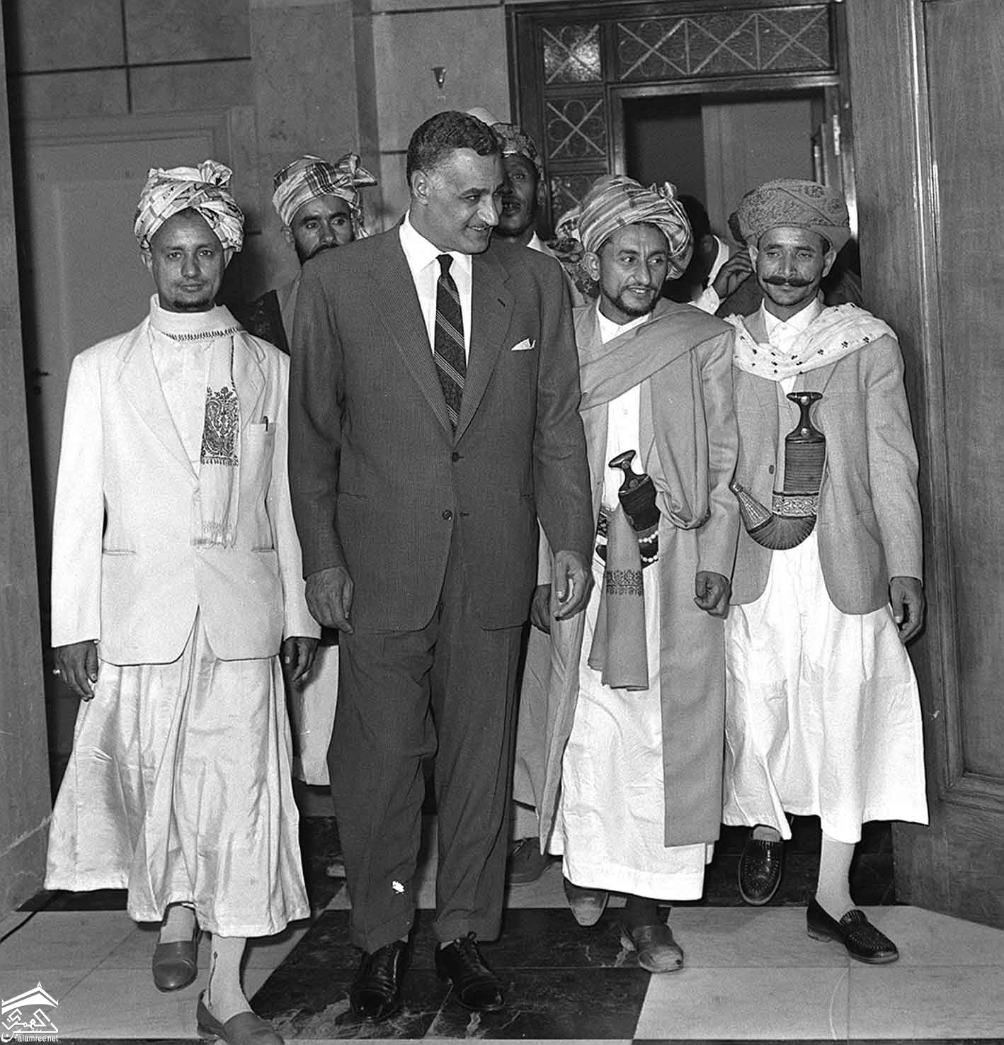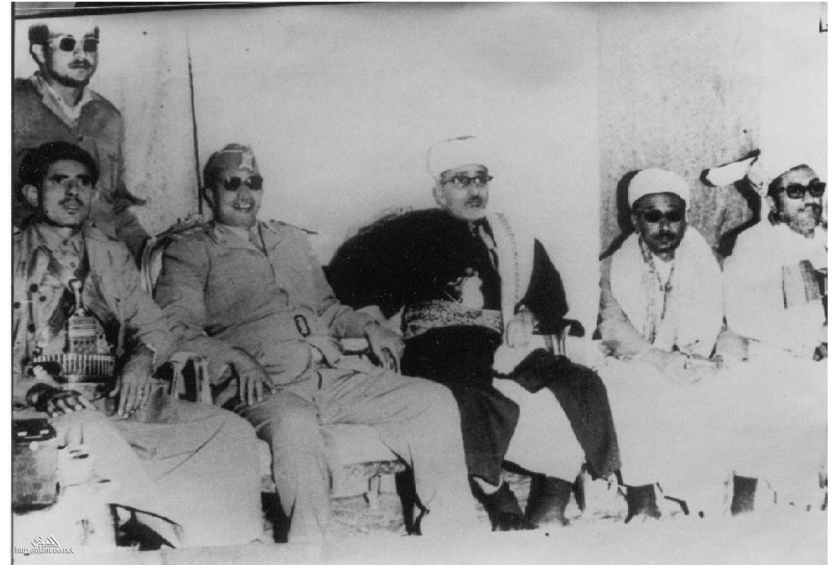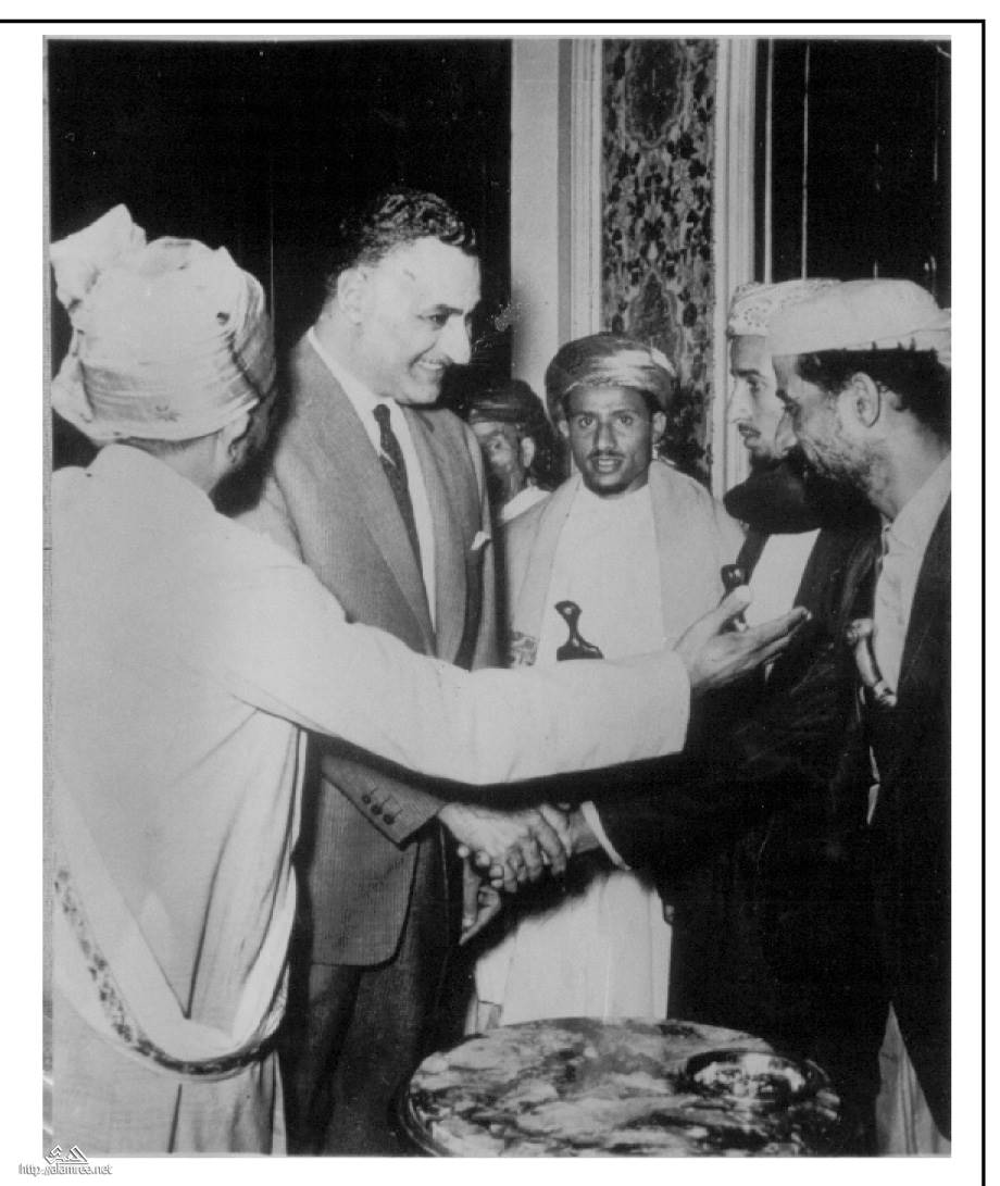 الرئيس جمال عبدالناصر وعلى يمينة الشيخ احمد محمد الكباب وعلى يسارة الشيخ