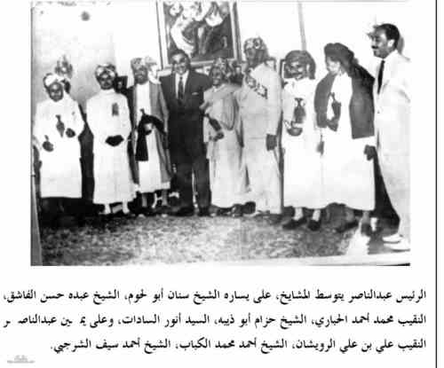الشيخ سنان ابو لحوم والشيخ احمد عبدربه العواضي مع جمال عبدالناصر |