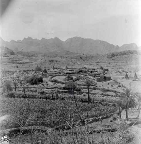 زراعة الذرة ومنازل العبيد السود السابقين، الذين كانوا يصنعون الأدوات المنزلية ويعيشون على التقاليد الأفريقية، في أكواخ خشبية. شمال اليمن. حيز بين تعز والحديدة (؟).