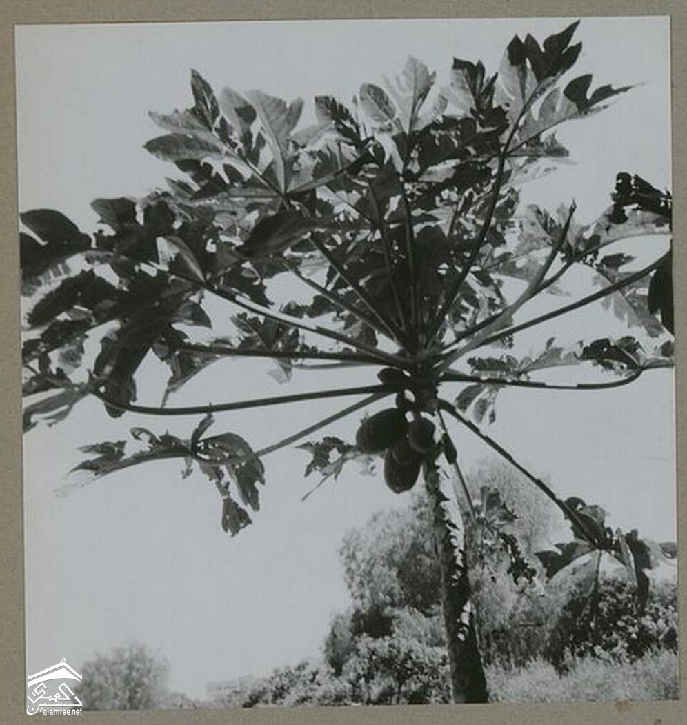 شجار البابايا والموز في حديقة محاطة بأسوار منخفضة بالقرب من تعز.