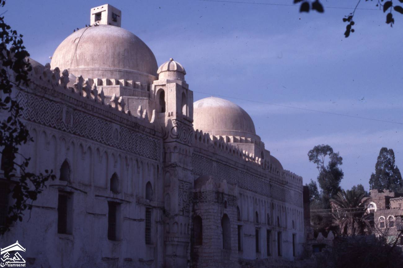 منظر خارجي لمسجد المظفر في تعز. تظهر قبتان باللون الأبيض داخل الجدران، وهي مغطاة بشكل مزخرف بإفريز هندسي يمتد على طول الجزء العلوي ويبرز شرفات ثلاثية الفصوص.
