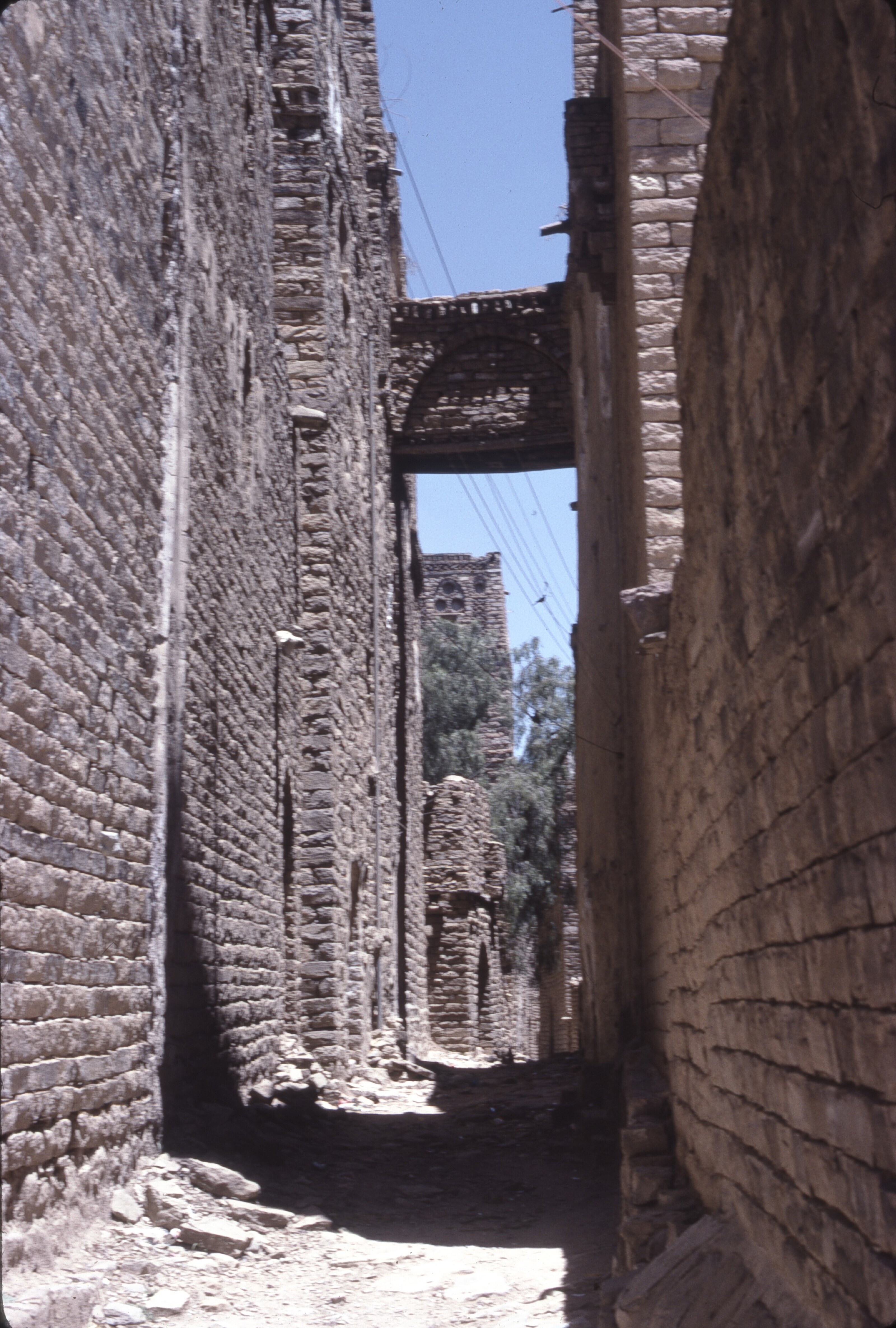 ثلا مباني شاهقة تصطف على جانبي شارع ضيق. جسر صغير يمتد عبر الزقاق بين مبنيين عام 1972-1980