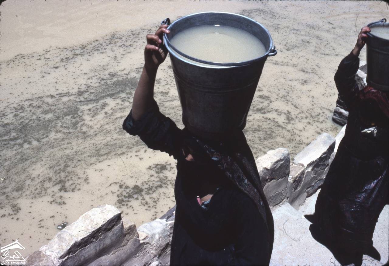 ثلا 1972 وخزان ماء وامراءة تتسلق الدرج بعد ملئ وعائها من الماء