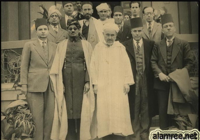 الصف الأمامي من اليمين إلى اليسار: محمد علي الطاهر - الزعيم التونسي الحبيب بورقيبة - الأمير عبد الكريم الخطابي - الأمير فضل بن عبد الكريم سلطان لـحـج - علال الفاسي زعيم حزب الاستقلال المغربي . الصف الثاني من اليمين إلى اليسار: الوطني التونسي الحبيب ثامر الذي قتل في حادث طائرة في الباكستان - محي الدين القليبي مرتديا الجبة التونسية - عبد الله الجفري مستشار سلاطين لـحـج مرتديا عمامة السلطنة المميزة ، |