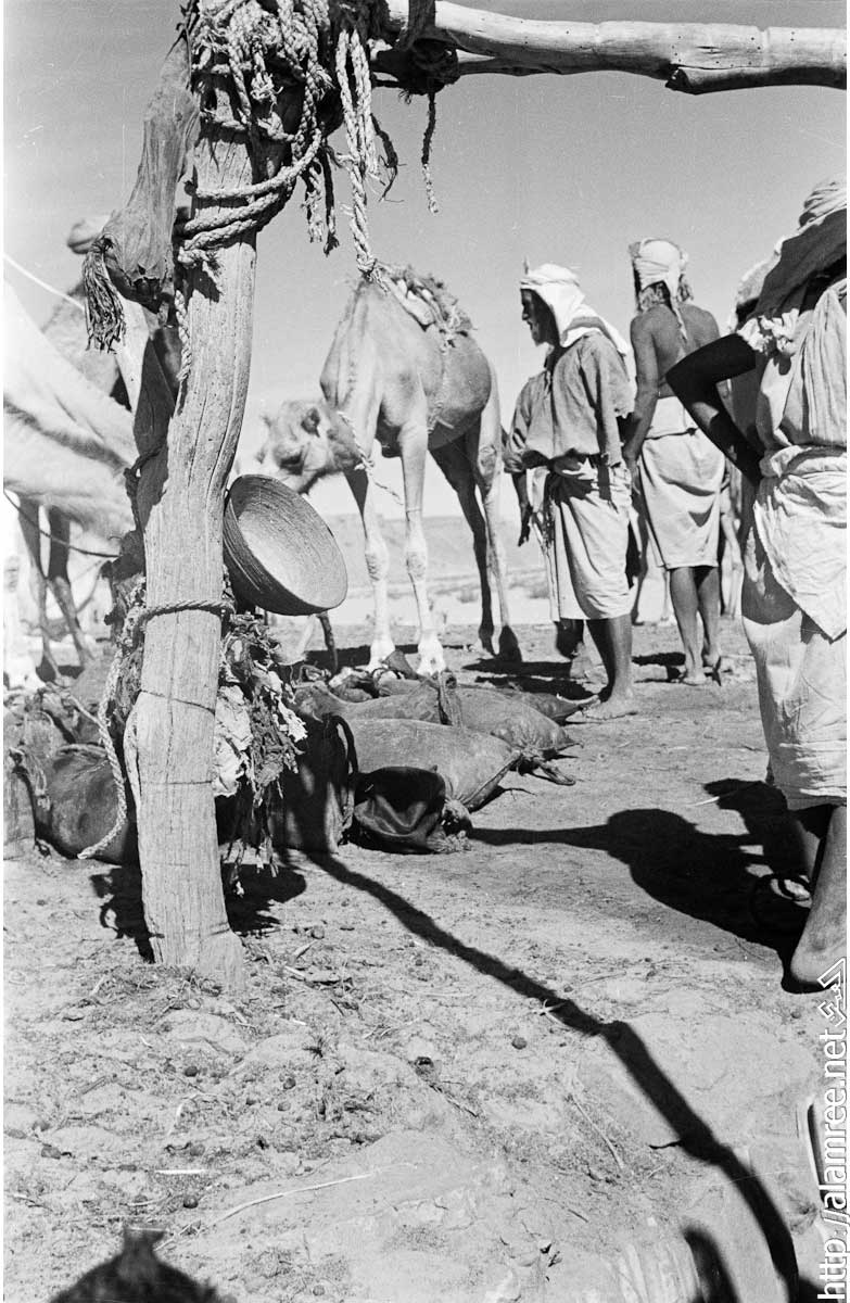 عرض لمجموعة بدو تسقي في منوخ . وتحفظ الماء في قرب من الجلد تقف في المقدمة. حشد من الابل في خلفيه الصوره