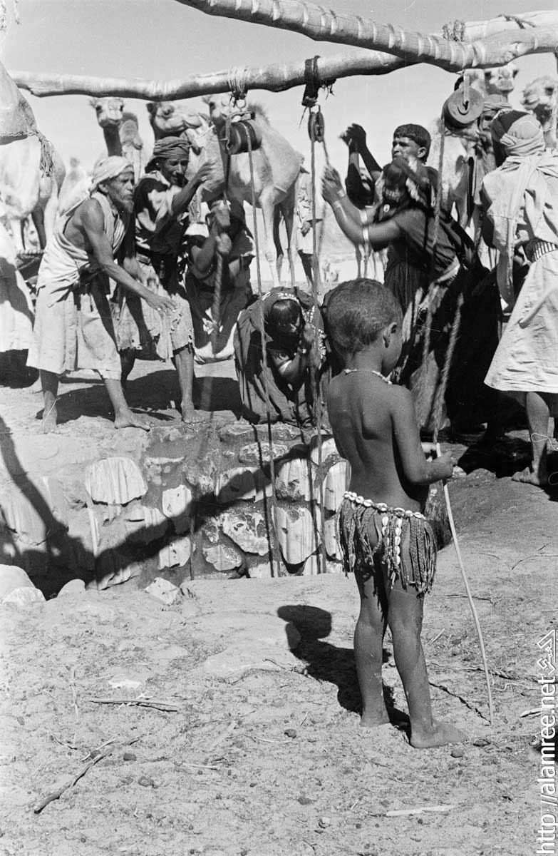 عرض لمجموعة من بدو الصيعر في منواخ . وتجمع حشد من الناس يستخدمون الحبال والبكرات لنقل المياه من البئر. وفي المقدمة امرأة يتم ملء قربه من الجلد بالماء.
