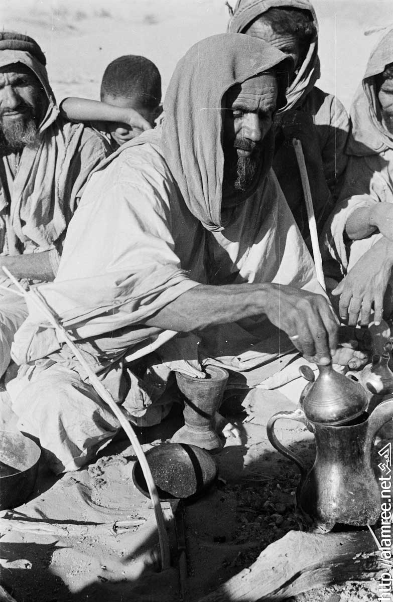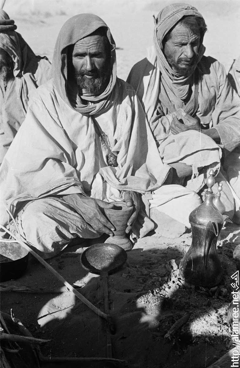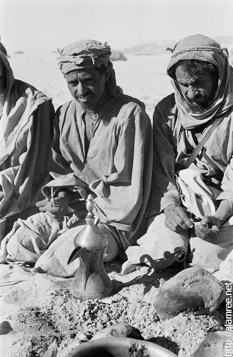 صورة مجموعة من الرجال من بدو الصيعر "بن معروف" يجلسون حول موقد النار في "منوخ" عاصمة ريدة الصيعر ، وفي المقدمة رجل يتحقق وعاء القهوه الموضوع على النار.