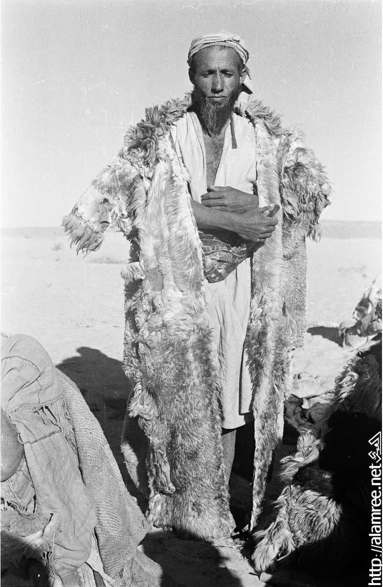 صورة لرجل كبير السن من سلالة بن معروف من بدو الصيعر في منوخ . وهو يرتدي عباءة جلد الغنم مع الفراء وخنجر في غمد على وسطه . .