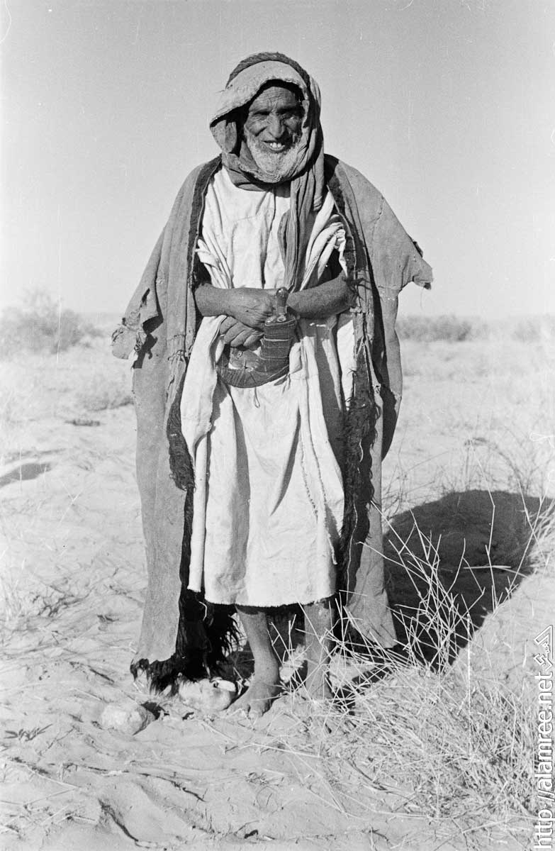 صورة لرجل كبير السن من سلالة بن معروف من بدو الصيعر في منوخ . وهو يرتدي عباءة جلد الغنم مع الفراء وخنجر في غمد على وسطه