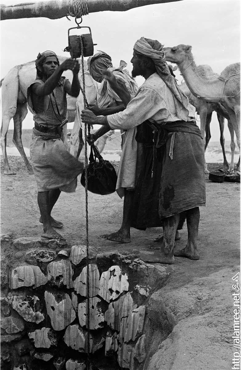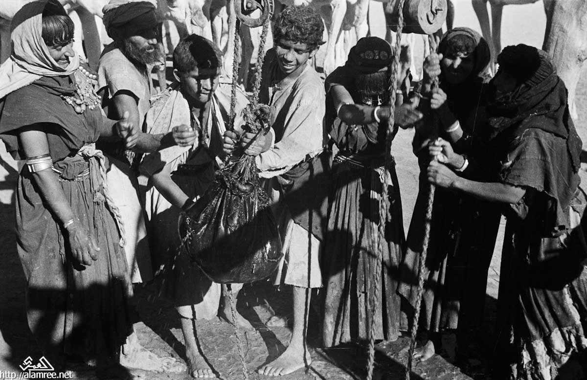 عرض لمجموعة من بدو الصحرا بالقربق من بئر تسقي في منوخ . وحشد من الناس باستخدام الحبال والبكرات لاستخراج الماء من البئرر.