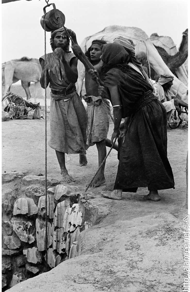 صوره لرجل وامراءه تستخدم حبل وبكرة خشبية لنقل المياه من البئر. في الخلفية الرجال الانتظار مع الإبل بالقرب من البئر .