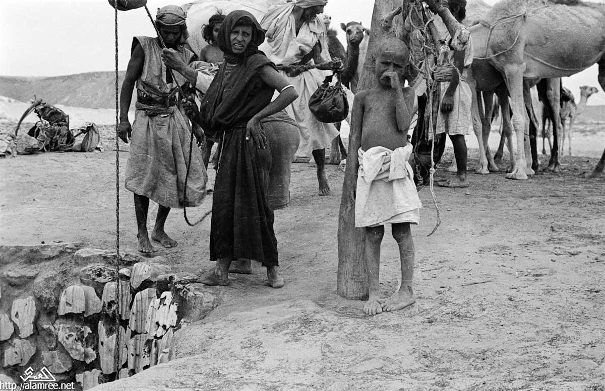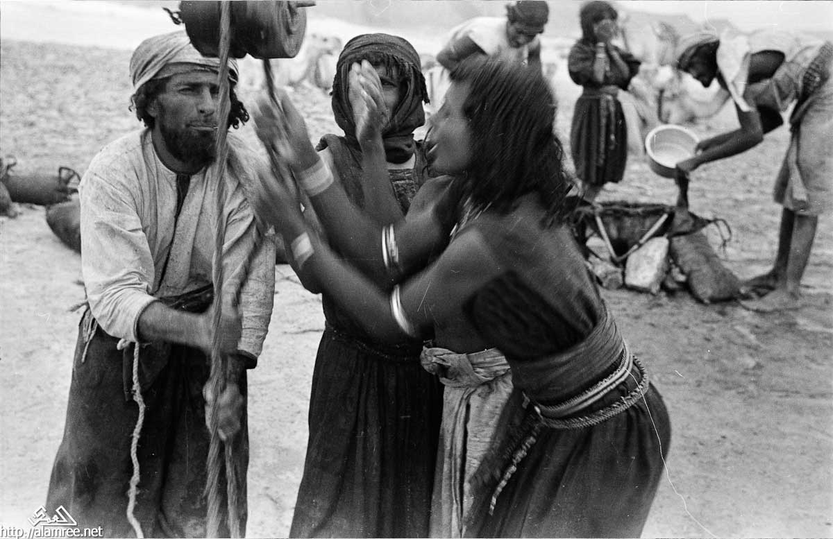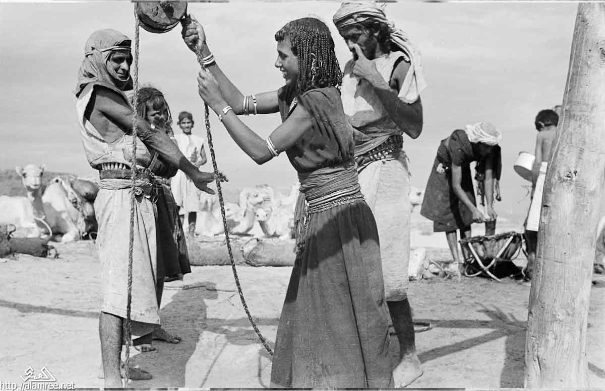 صورة لاثنين من النساء البدويات الصيعر ورجل نقل المياه من منوخ . انهم يستخدمون حبل وبكرة خشبية لنقل المياه من البئر. في الخلفية انتظر عدد قليل من الناس بالقرب من البئر.