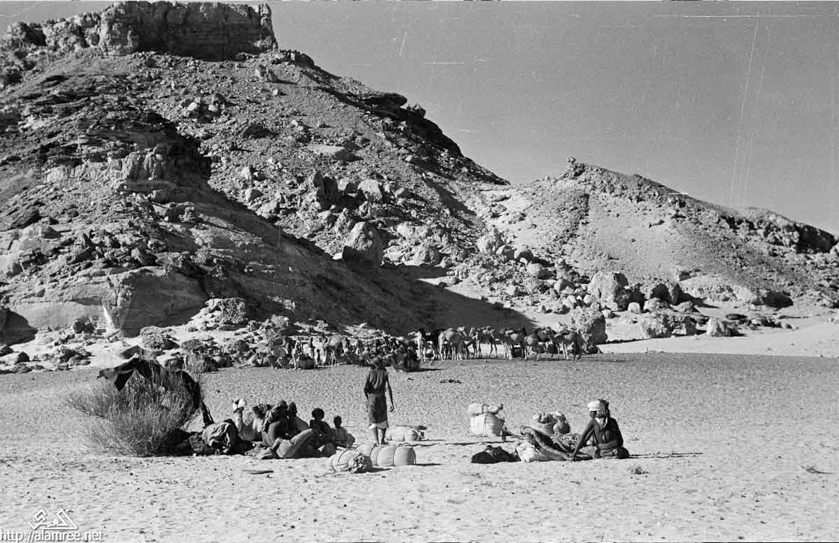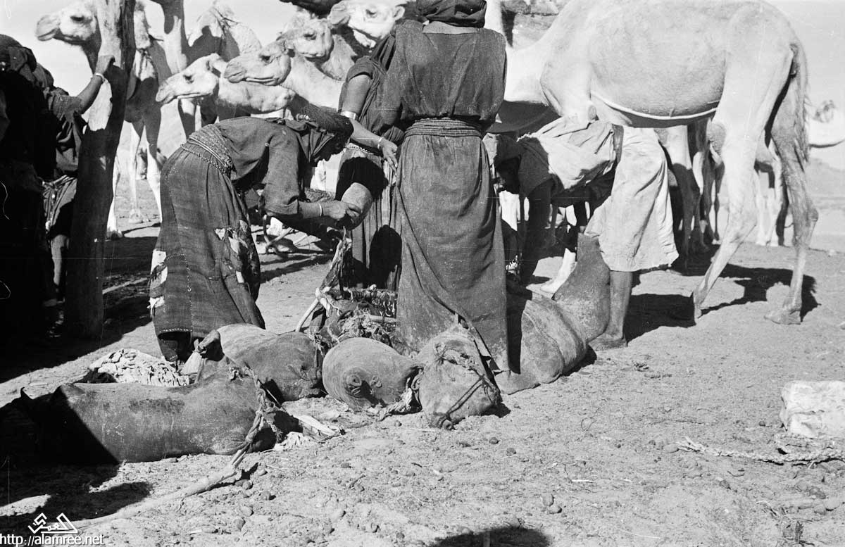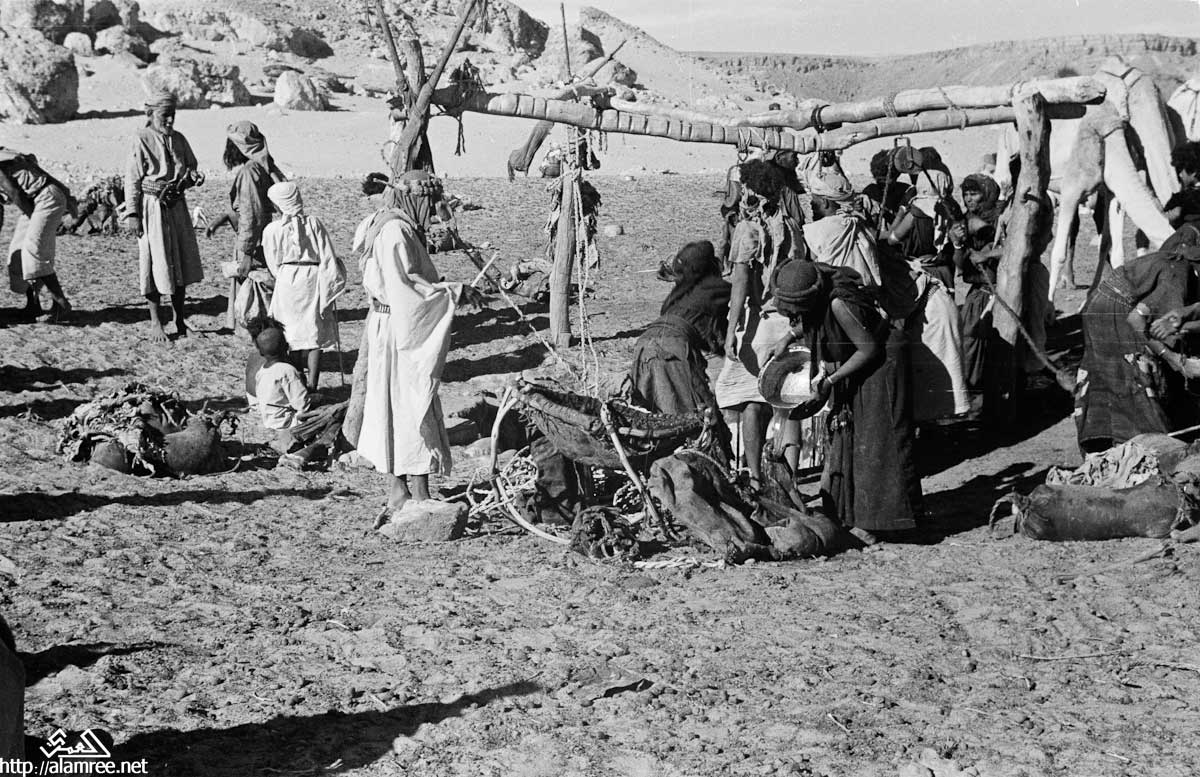 عرض لمجموع من البدو تسقي جمالها من بئر في منطقة منوخ في ريدة الصيعر حضرموت