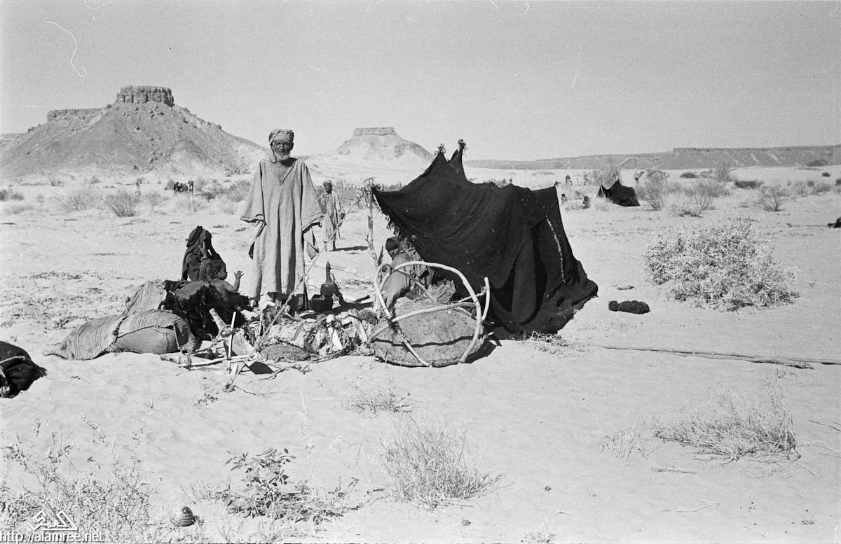 عرض لعائلة من قبيلة بن معروف من بدو الصيعر تجمعوا بجوار خيمتهم في منوخ . ووساده تكمن في الرمال حول الخيمة، ويرجح انها مصنوعة من شعر الماعز