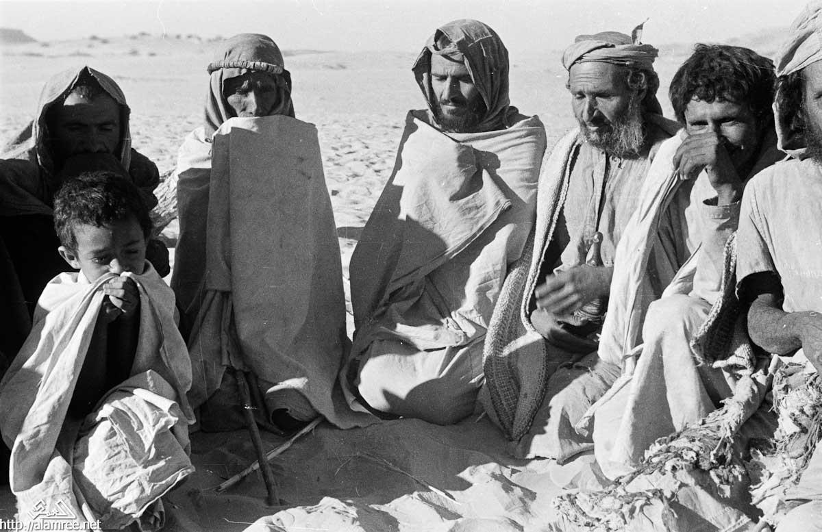 صورة مجموعة من بدو الصيعر قبيلة بن معروف يجلسون على الأرض في منوخ ريدة الصيعر