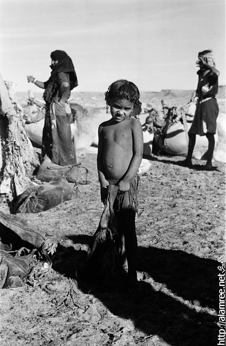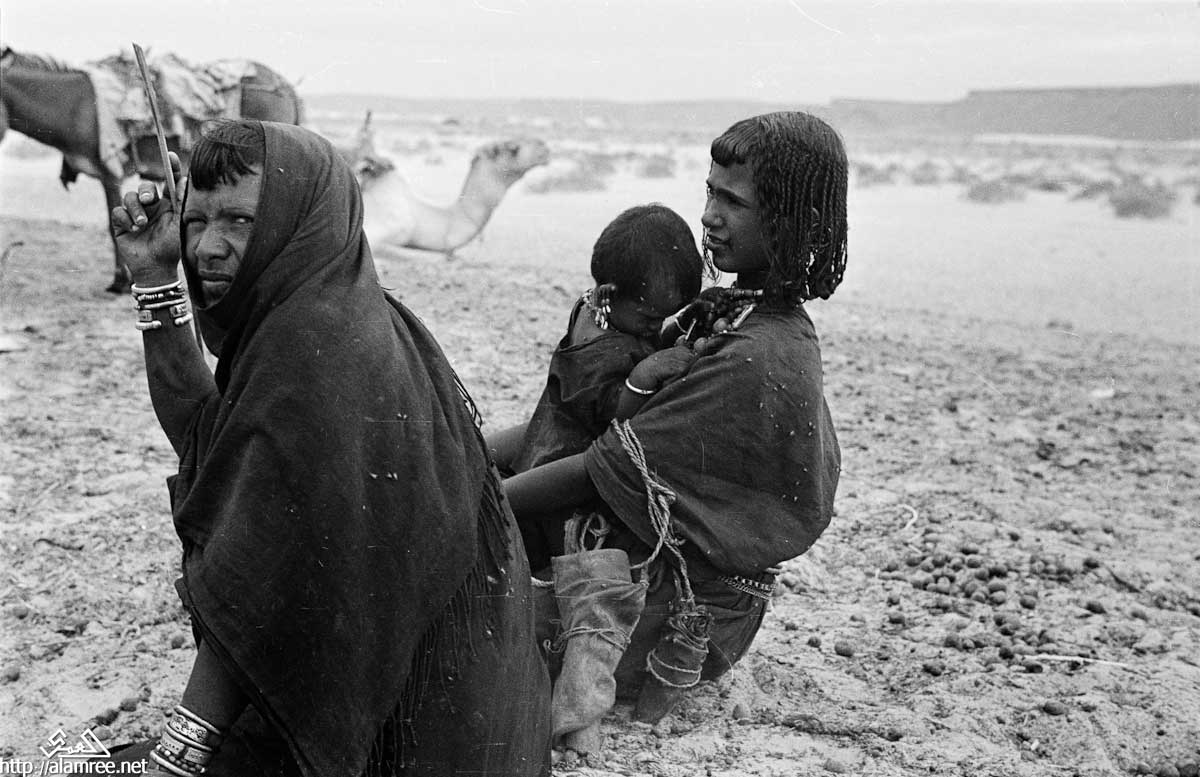 عرض لامرأة وفتاة تحمل طفل صغير يجلسوا على الأرض . وهم من جماعة البدو الصيعر في منوخ