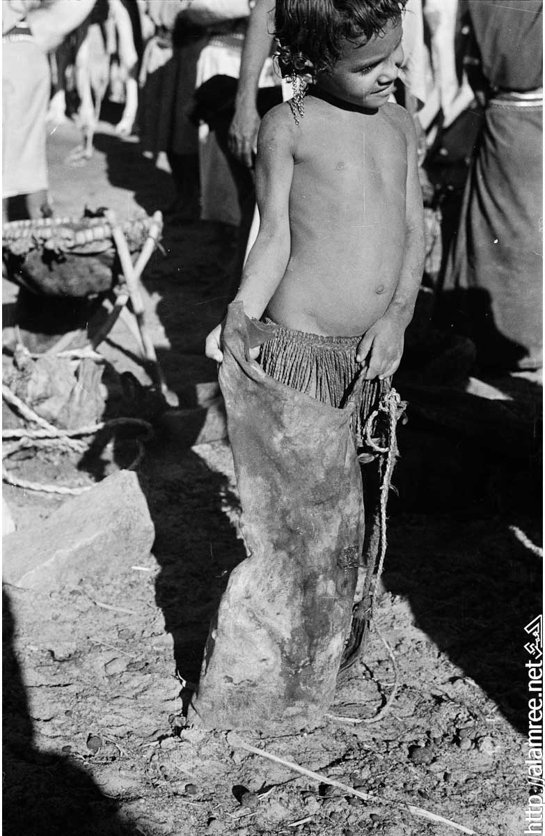 صورة لطفل صغير منبدو الصيعر في بئر منوخ. الطفل هو يرتدي تنورة مهدب الأقراط الطويلة تتدلى من آذان الطفل. ويحمل قربة من الجلد.