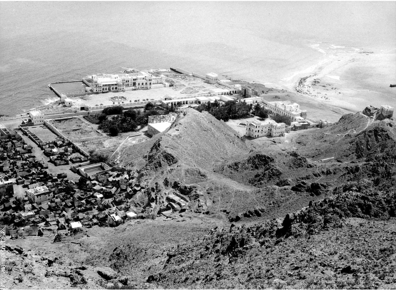 المكلا قصر السلطان القعيطي عام 1931م وفي وسط اليسار عشش العبيد من الصومال وغيرهم