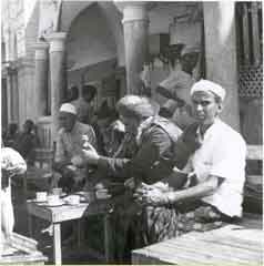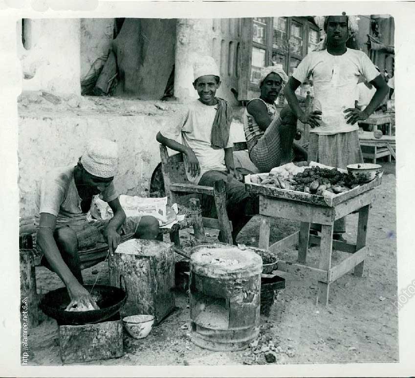 احدى حواري المكلا في الستينيات وبيع الاكلة الشعبيه البحريه "كراش" وتتكون