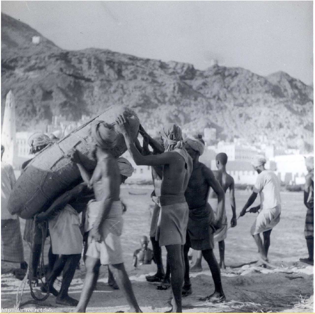 المكلا الميناء وعمليات شحن وتفريغ البضائع كانت تتم عبر ايادي عمال عضليين دون وجود الات تساعد في ذلك