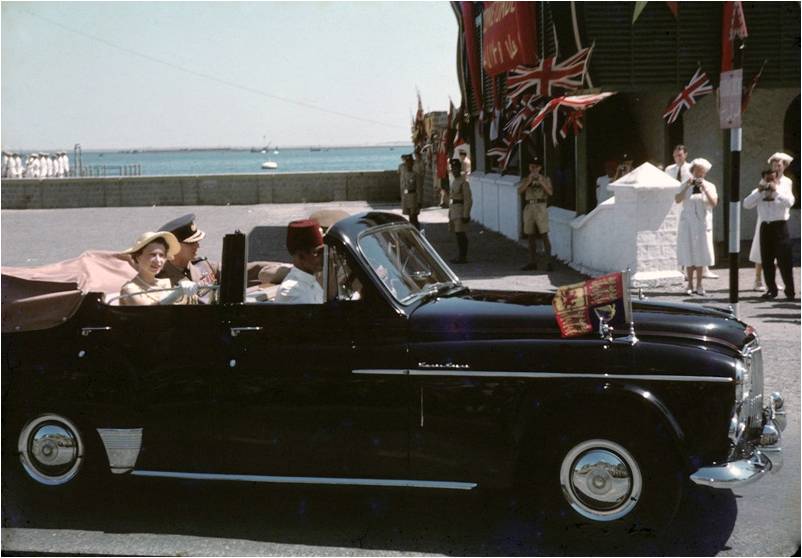 ملكة بريطانيا في السيارة الملكية الخاصة يقودها المرحوم انور محمود خان يرحمه الله والسيارة هذه لا زالت موجوده في عدن لدى عائلة المرحوم انور تاج
