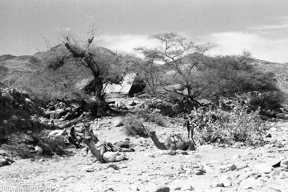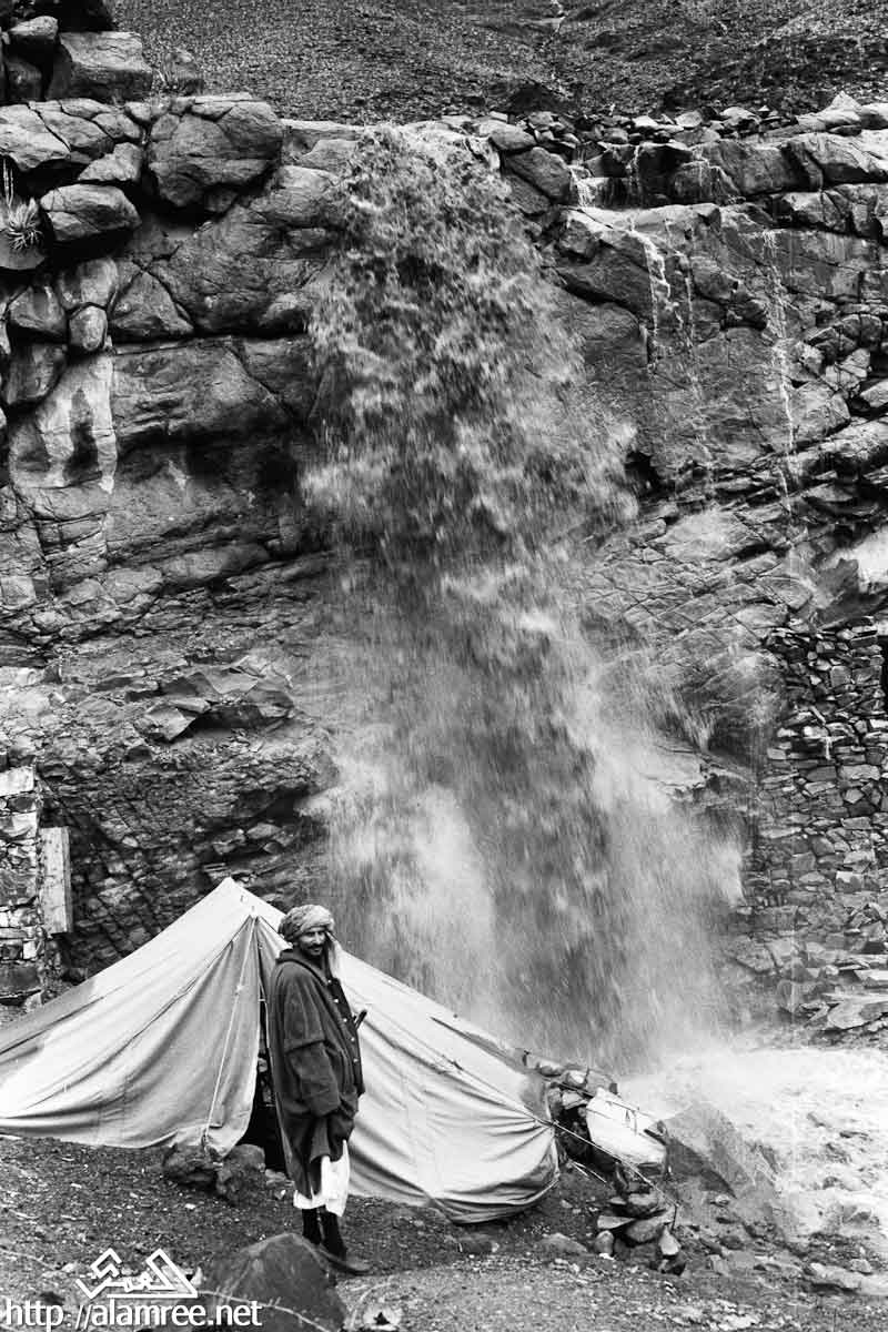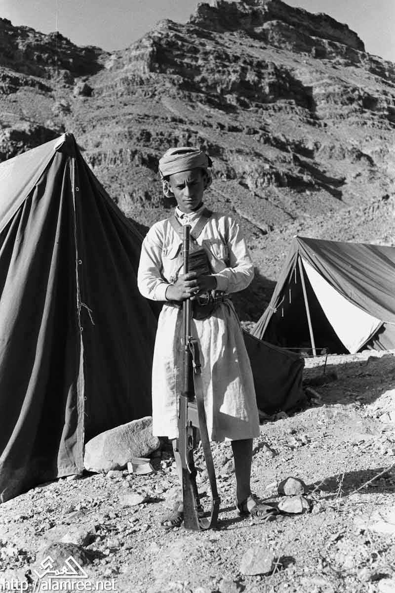 صورة لصبي وقف أمام بعض الخيام وممسكا ببندقية كبيرة ومعلوم استخدام الملكيين للاطفال في معاركهم