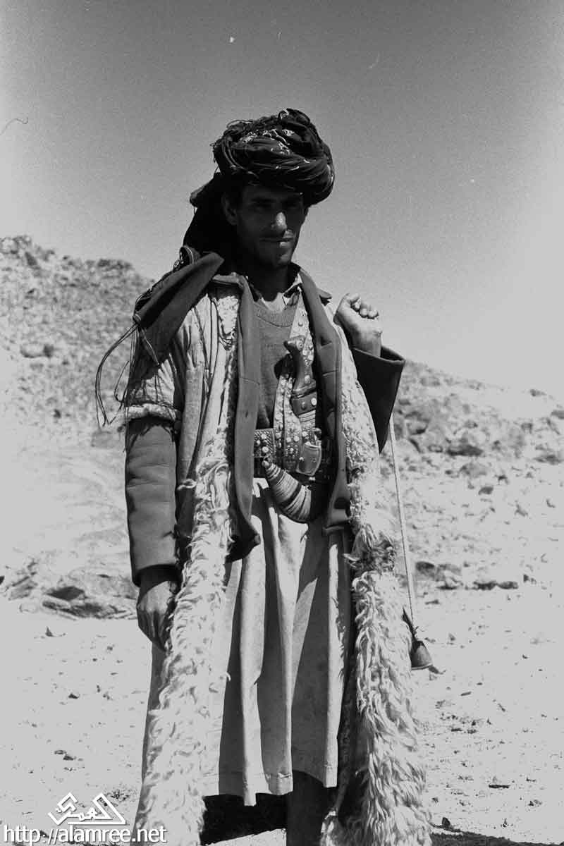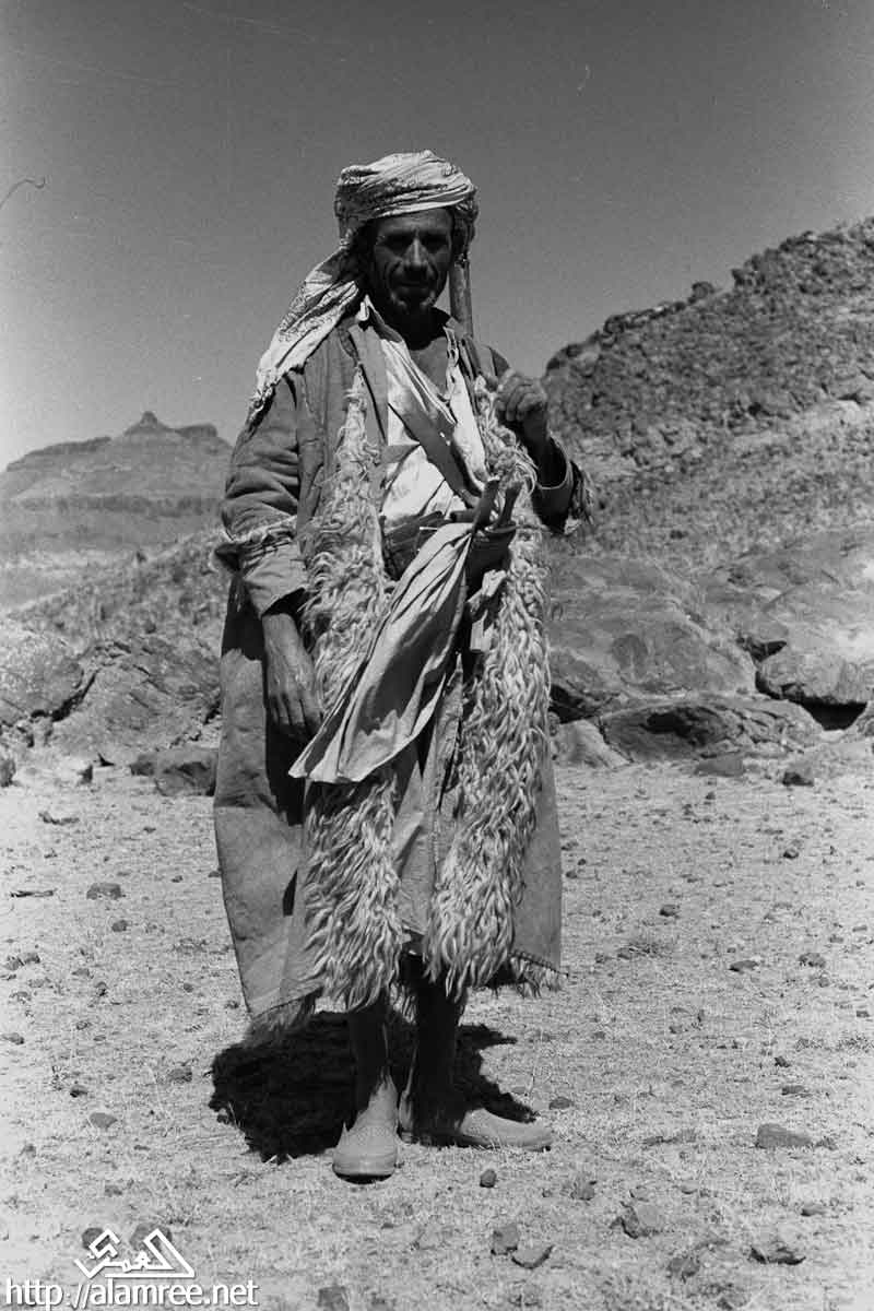 صورة لرجل مع خنجر مغمد كبير في حزامه ويرتدي معطف جلد الغنم