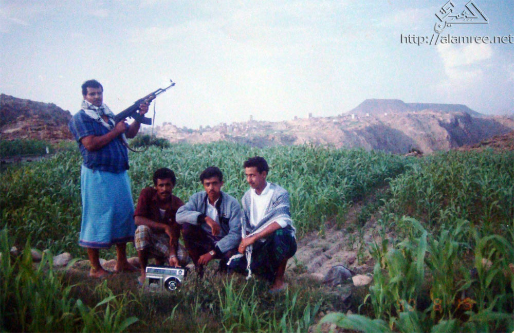 صورة صاحب الالبوم يسار واصدقاء اخرين وفي الخلفية جبل حبه لبعوس يافع