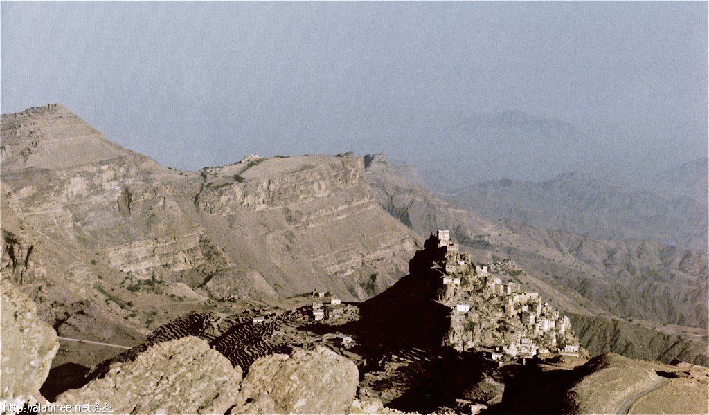 منظر لقلعة القاهرة والقصر القديم بحجة. تم بناء التحصينات على سفح الجبل شديد الانحدار، ويظهر في الأعلى مبنى، وهو جزء من القصر القديم. تظهر مستوطنة أخرى على قمة تل إلى اليسار، مع مصاطب متدرجة تملأ المنحدرات الخضراء شديدة الانحدار. الجبال ترتفع في المسافة