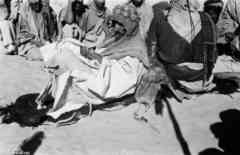 عرض لمجموعة من بدو الصحرا بالقربق من بئر تسقي في منوخ . وحشد من الناس باستخدام الحبال والبكرات لاستخراج الماء من البئرر.