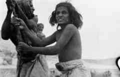 صورة لطفل صغير منبدو الصيعر في بئر منوخ. الطفل هو يرتدي تنورة مهدب الأقراط الطويلة تتدلى من آذان الطفل. ويحمل قربة من الجلد.